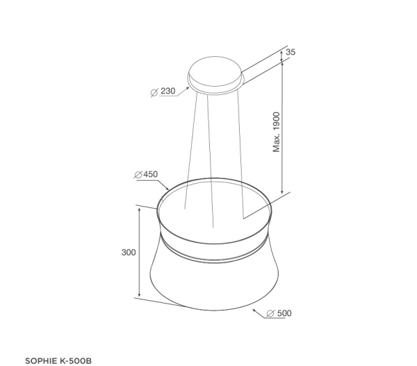 Máy hút mùi Malloca SOPHIE K-500B với thiết kế dạng hình cầu phá cách, thân máy bằng inox, sơn đen sang trọng, tinh tế phù hợp với nhiều không gian bếp hiện đại. Máy hút mùi đảo, treo độc lập, dễ dàng phối hợp thiết kế không gian bếp hiện đại.
