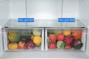 – Ngăn rau củ quả được chia thành 1 ngăn đựng thực phẩm tươi và 1 ngăn đựng thực phẩm khô, có khả năng duy trì được độ ẩm chuyên biệt để giúp bảo quản thực phẩm được tốt hơn.