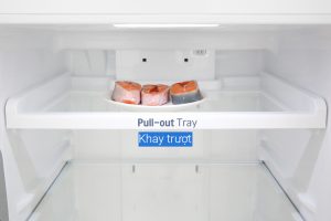Một trong những ưu điểm của chiếc tủ lạnh này đó là được thiết kế khay kéo trợ lực PULL-OUT TRAY. Nhờ khay kéo này, người dùng có thể kéo – đẩy một cách nhẹ nhàng và dễ dàng lấy phẩm từ trong cùng.