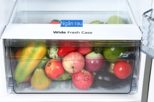 Bảo quản nhiều rau củ trong ngăn Wide Fresh Case, thao tác tiện lợi với góc mở rộng tối đa